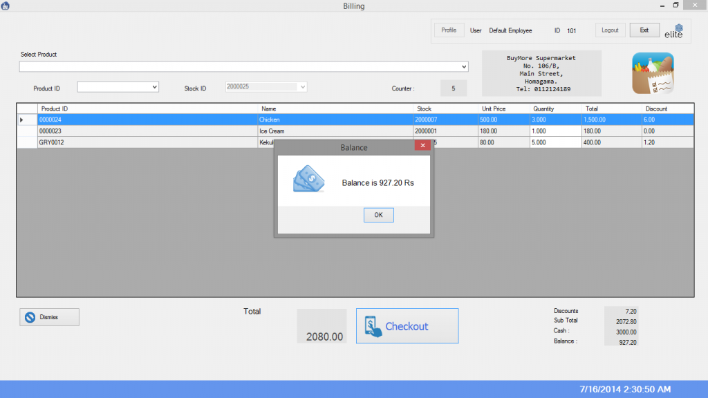 An easy to use billing interface is provided by the application for sales people. They will have to input the stock Id of the product to keep clear track of the inventory status. Upon billing, stocks would be automatically deducted.
