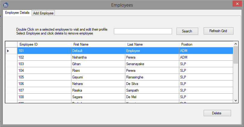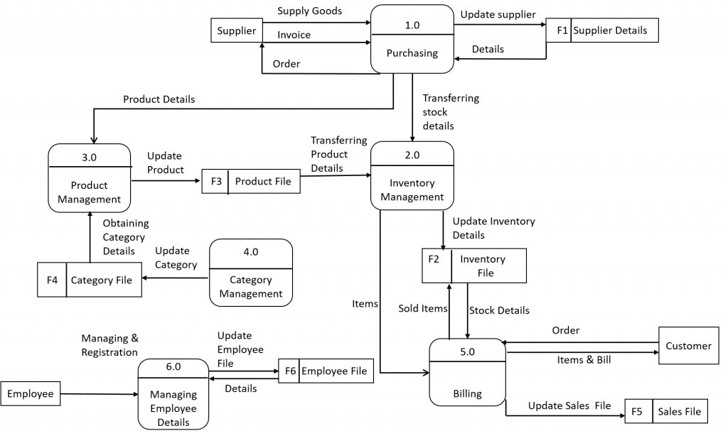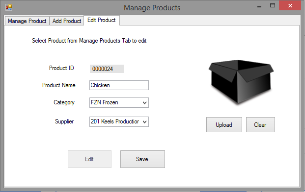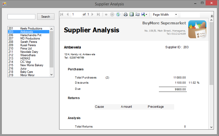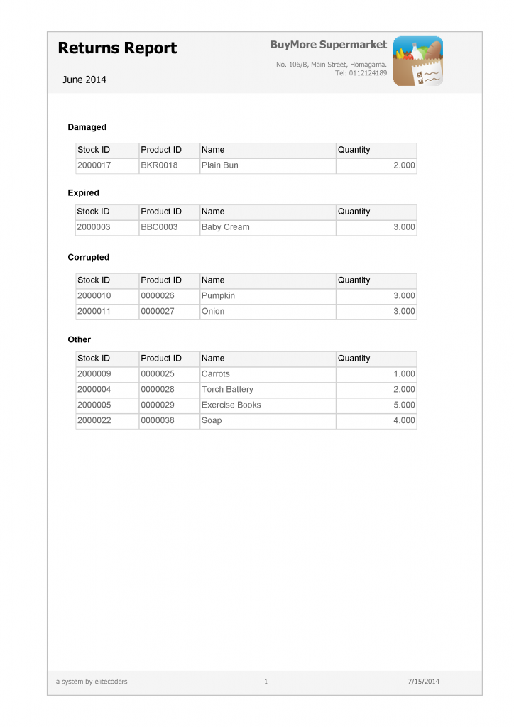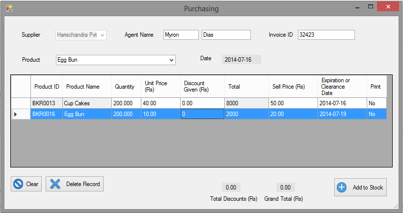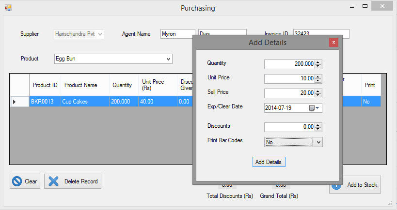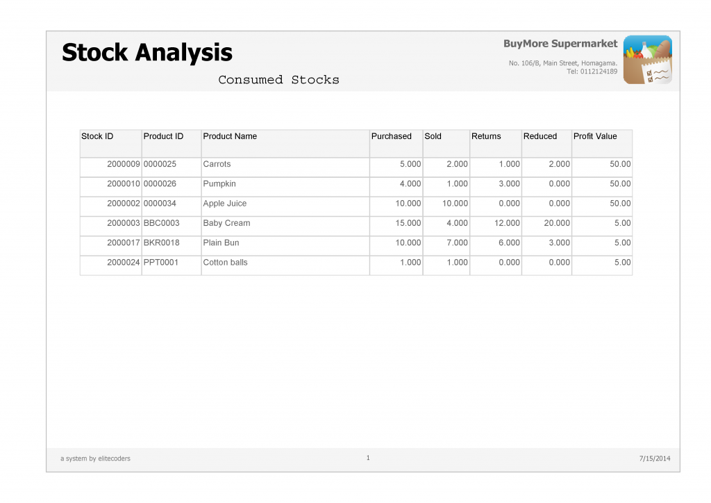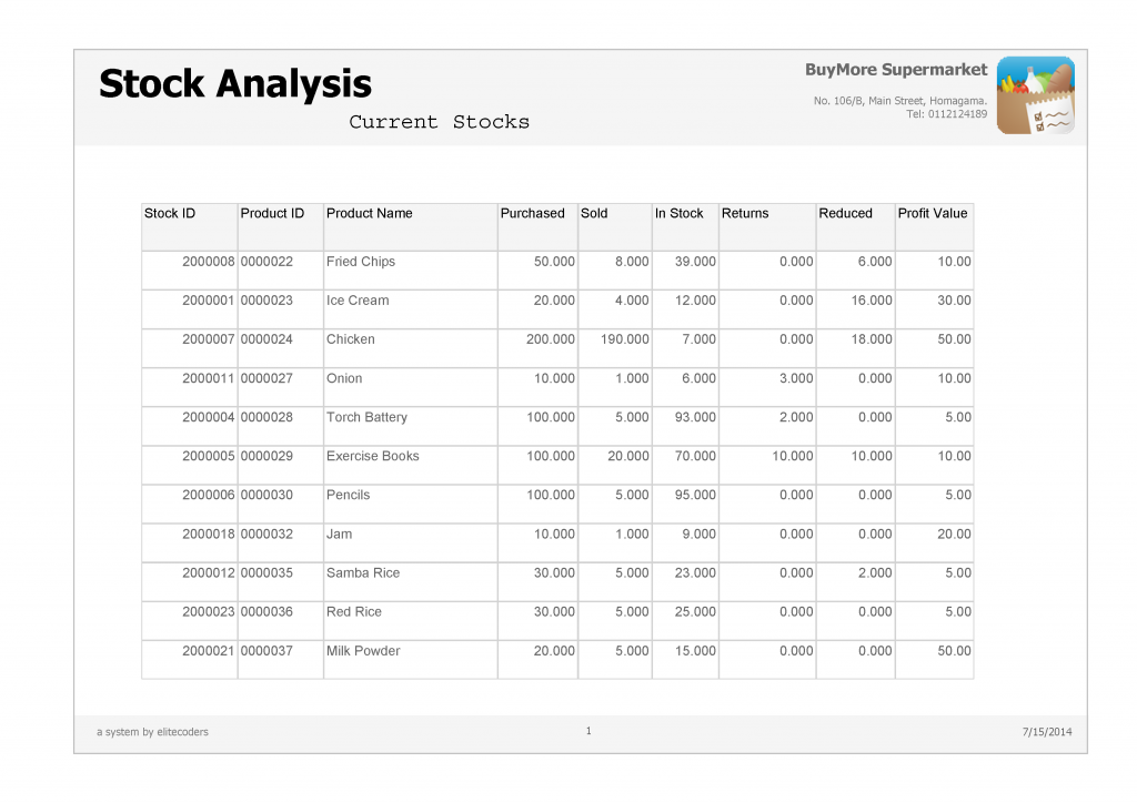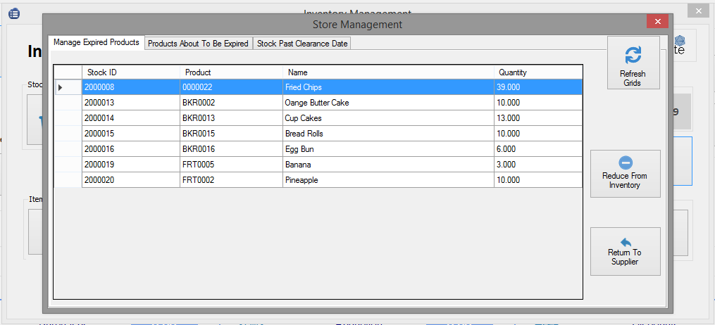 System allows entity management for suppliers, categories, products and employees. Stocks obtained by various suppliers can be recorded, and subsequently updated when reductions and returns are made. Discounts can also be added to stocks.