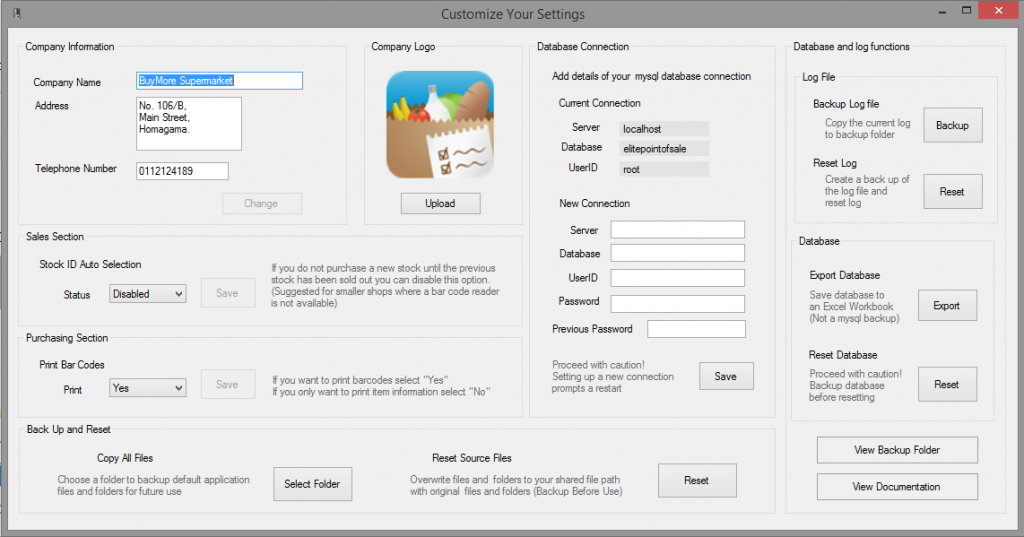 A stable internet connection is required in order to prevent data loss if the mysql database is hosted online. If not, the local server should be maintained in a proper way to serve the same purpose. The database is made in mysql in order to give the user a chance to develop a website if needed. The stocks could be updated as the people place an order and check out from the shopping cart so the reports produced by the application could still be consistent with marketing. It is further recommended that the administrators back up databases and logs frequently with the options provided in the application, as well as from the mysql host.
