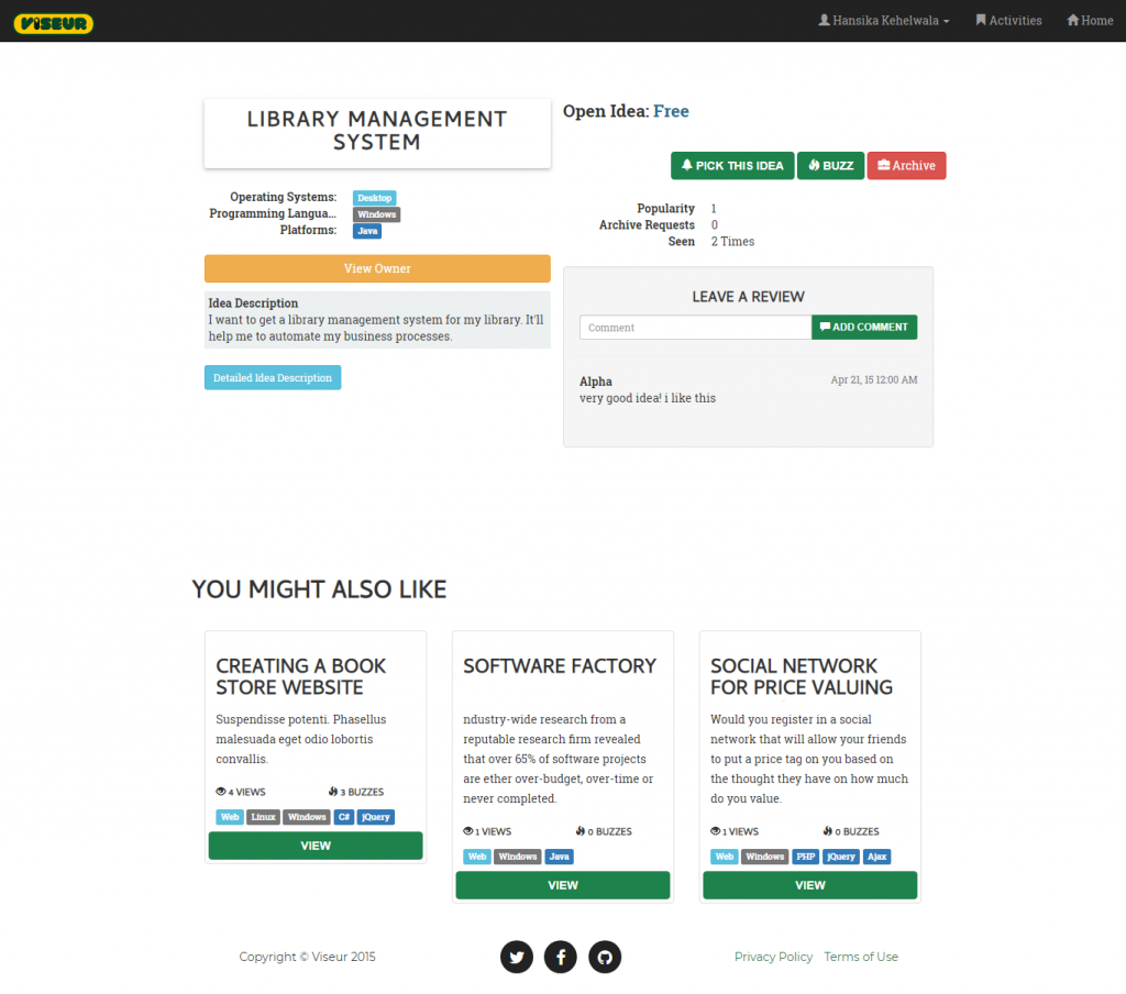 If the idea owner offers a price for the development of the project, reserving the project will be free of charge and after the reserve request, the contact details of the owner will be displayed. Level 2 users will also be allowed to comment alternative software suggestions to the level 1 users and make archive requests.