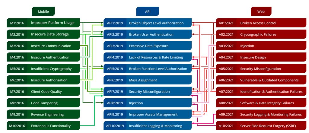 The good news is that whatever controls you apply at the API level will mitigate a subset of security issues from Mobile and Web apps that consume the API. This doesn’t mean that everything can be controlled at the API level. You can see that some categories have no links to each other at all. But the security controls you apply at the API level will propagate to both mobile and web security when they consume the API, which might save you a lot of man-hours in bug fixing.